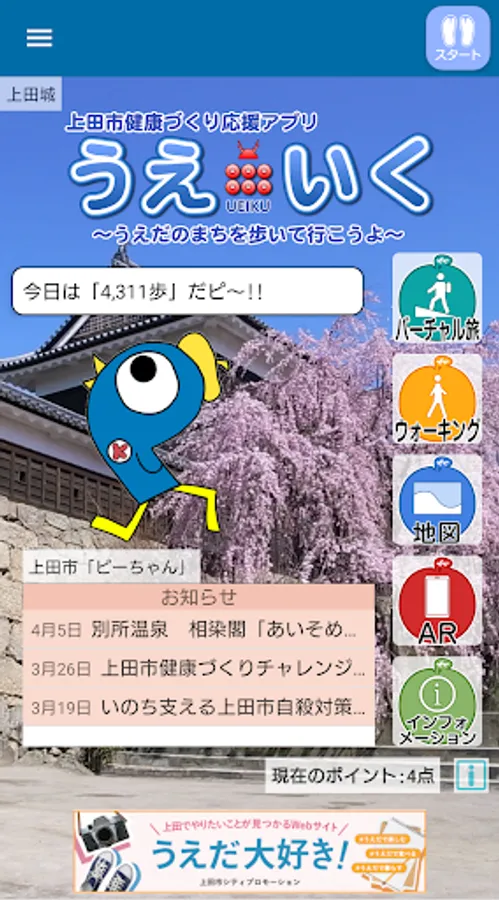 "Ueku" is a walking app for raising information on health in daily life, and having information in Ueda City, to keep you healthy while enjoying it.