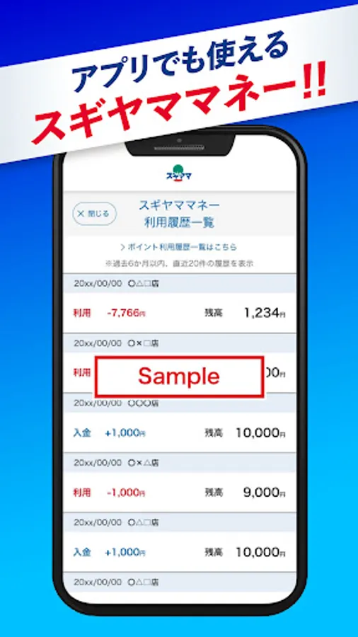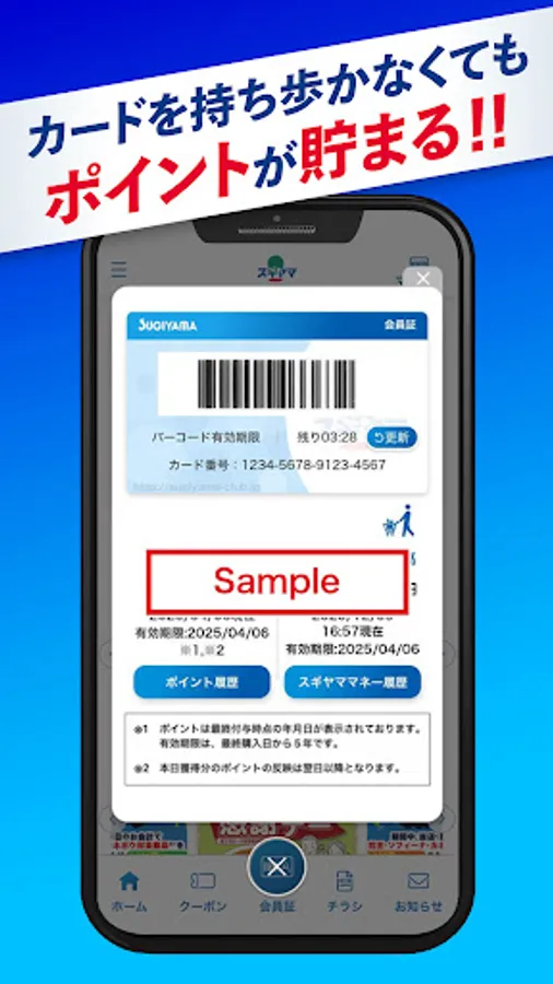 If you set your Sugiyama card in the app, you can use it as a membership card. By presenting it at the cash register, you can not only earn points, but also charge and use Sugiyama Money.