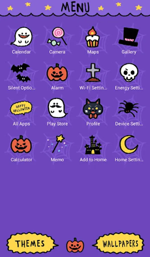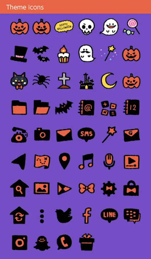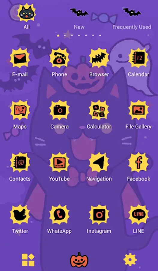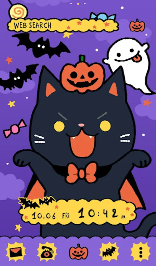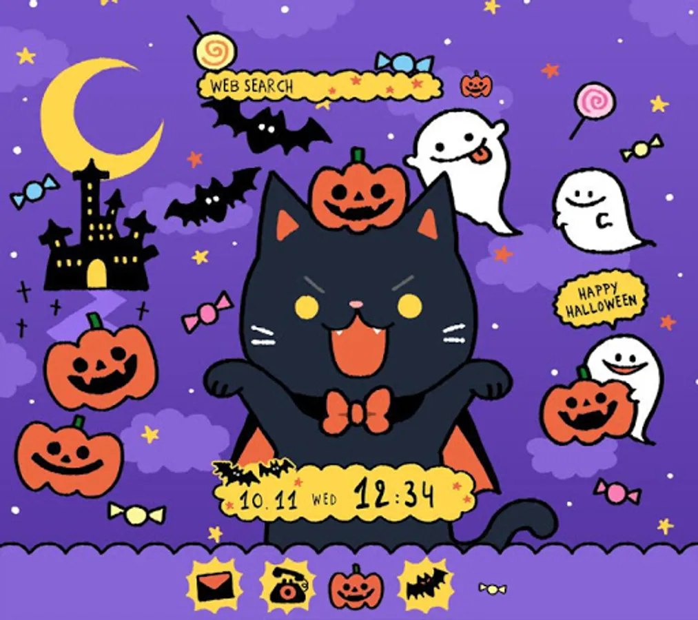 An illustrated Halloween theme with a pumpkin, bats and a black cat.