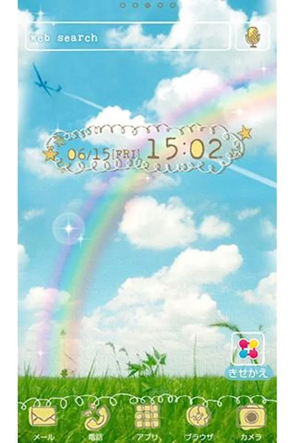 A rainbow across the blue horizon. Contrail that stretches miles away, with a cute hand drawn clock widget icon.