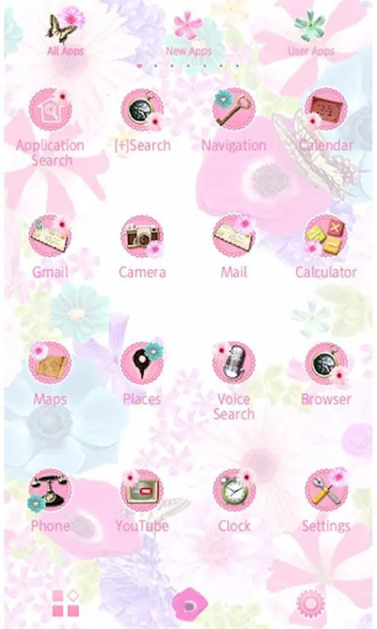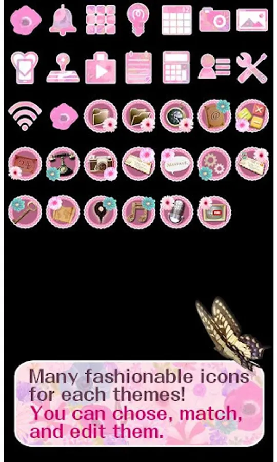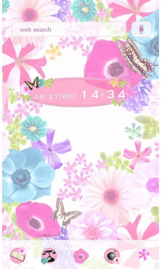 The cute wallpaper of this Theme features an arrangement of pink, purple, and blue flowers on a simple white background. The butterfly accents are perfect!