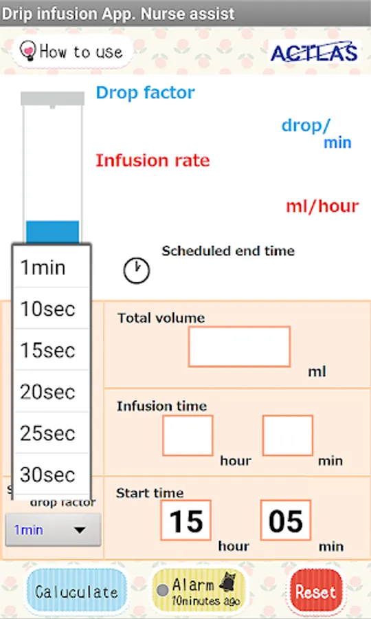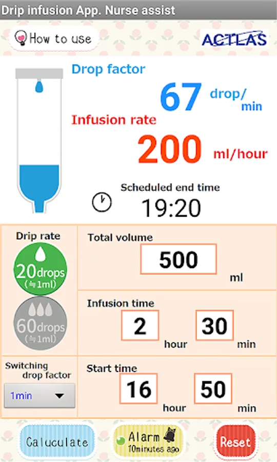 With this application, you can calculate the number of drops per minute and the dose per hour just by entering the instillation time and total volume of infusion instructed by the doctor.