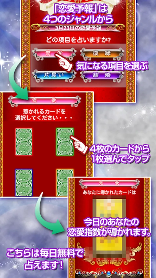 また無料で毎日占える「1日1回恋愛予報」も大人気メニューになっております。