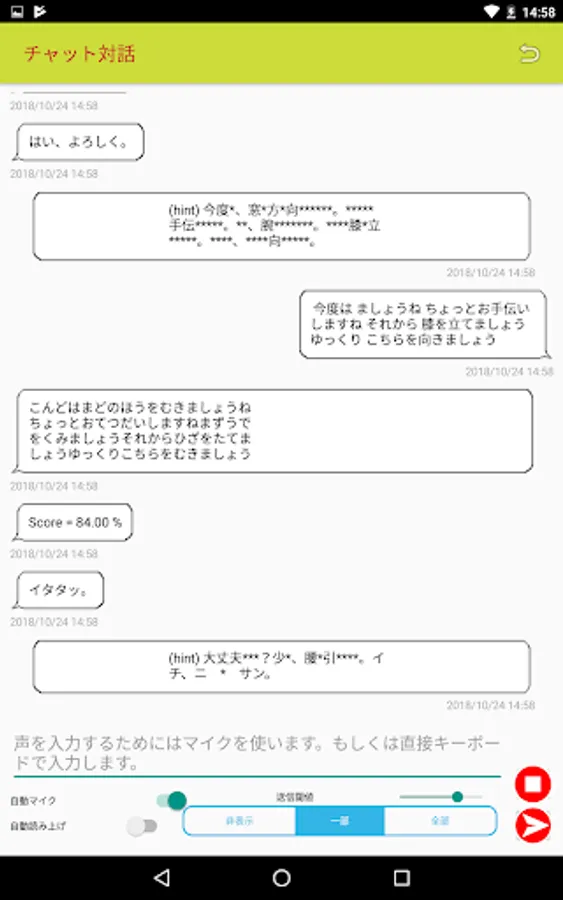 (3)音声認識と ChatBot 技術を使って、練習中の音声を、コンピュータが採点します。正しく覚えて、正しく発音できるかどうか、採点結果を見ながら、練習できます。
