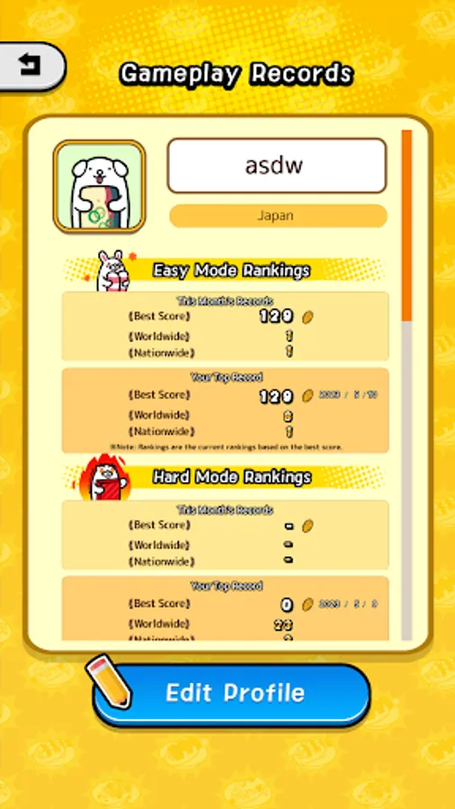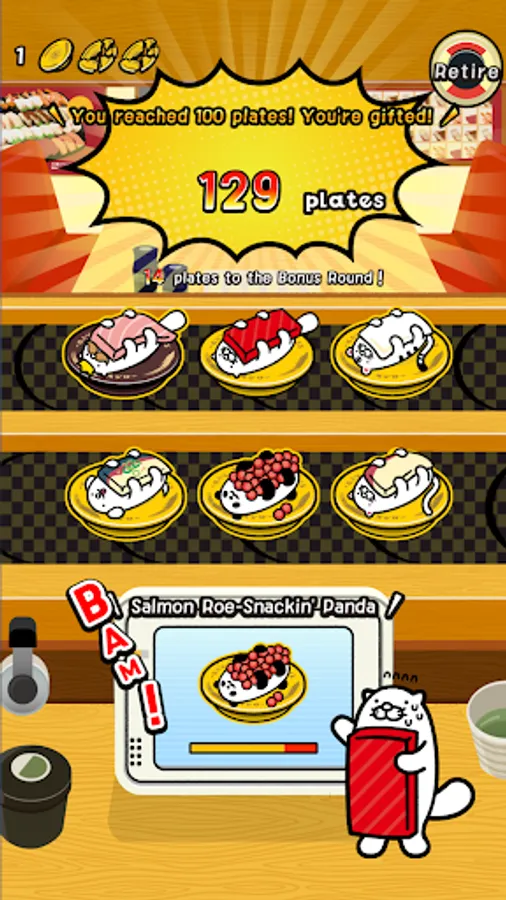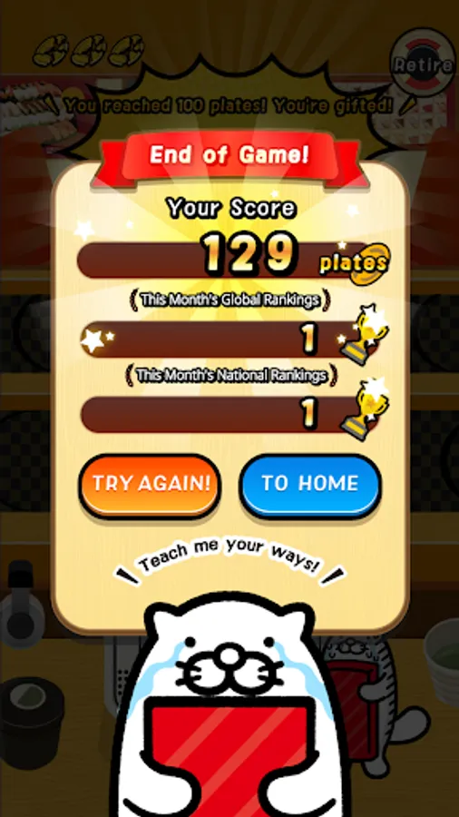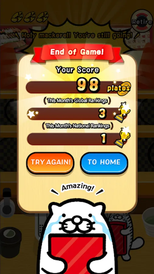 The score you accumulate by tapping the correct Dakko sushi is displayed in the worldwide and national monthly rankings. When certain conditions are met, 'Dak! Dak! Dak! Mode will be activated, and you can aim to boost your score. Your highest score will be listed on the records, so try your best break the top record.