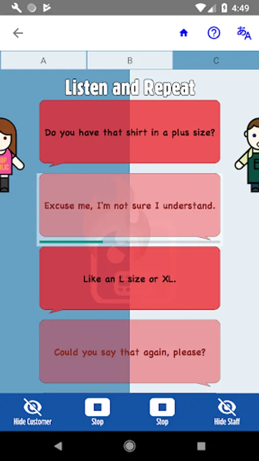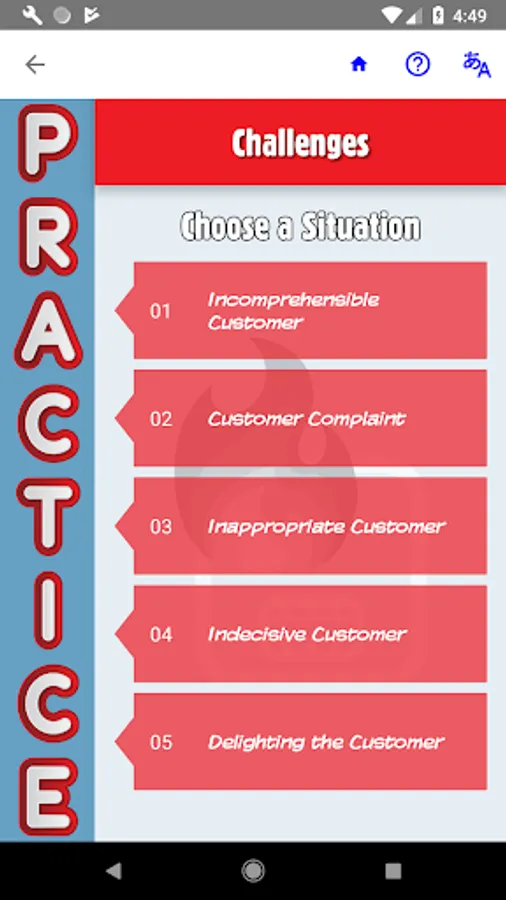 A range of dialogues covering basic situations and common challenges, which you can roleplay with a computerized customer.
