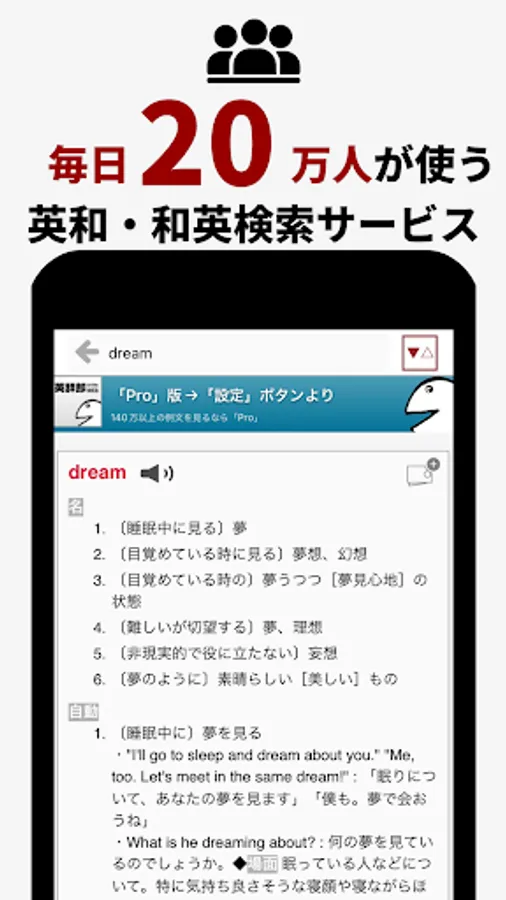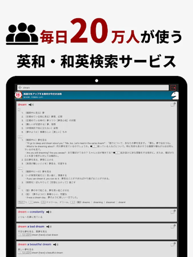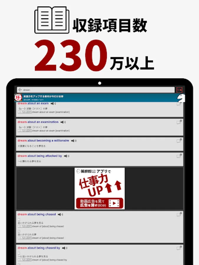 This is a free English dictionary (English-Japanese/Japanese-English dictionary) app that contains over 2.3 million English-Japanese headings and over 2.58 million Japanese-English headings.