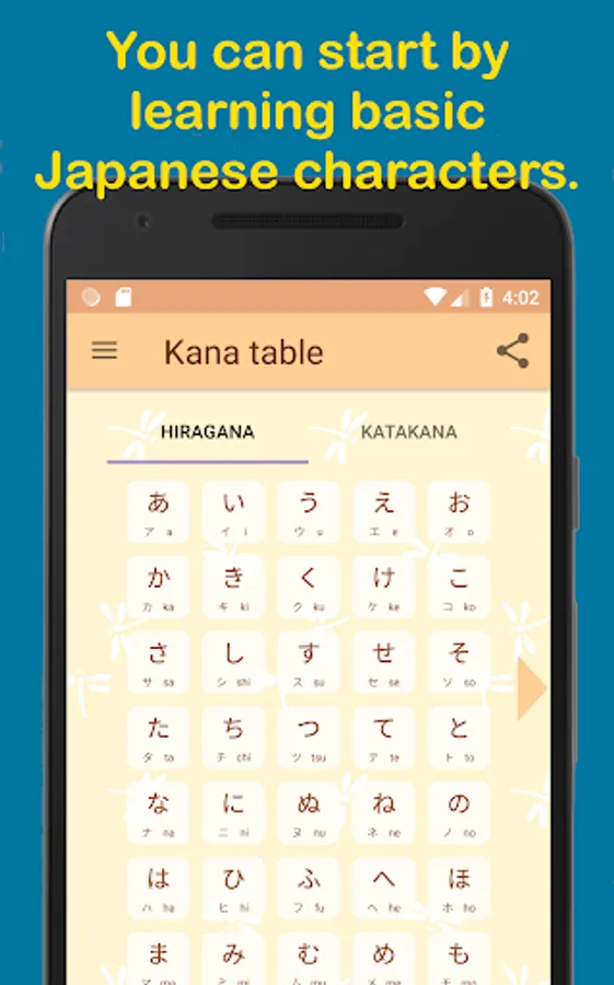In the Kana table, you can check the following items of Hiragana and Katakana: