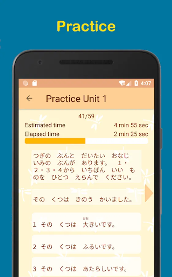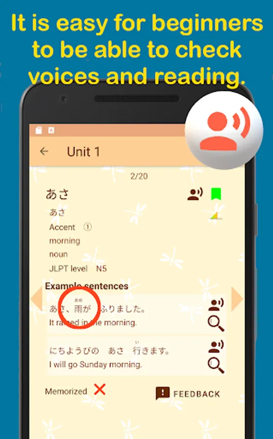 Also, this app is designed to be able to learn real Japanese efficiently, even for beginners. For example, all Kanji in the example sentences have how to read. Additionally, this app has a dictionary, so you can effortlessly search by just touching the example sentences or choices of questions. Moreover, this app has plenty of example sentences that have voices by Japanese native speakers. So you can acquire standard and natural Japanese. In short, this app is easy to practice. Now, let's try it out.