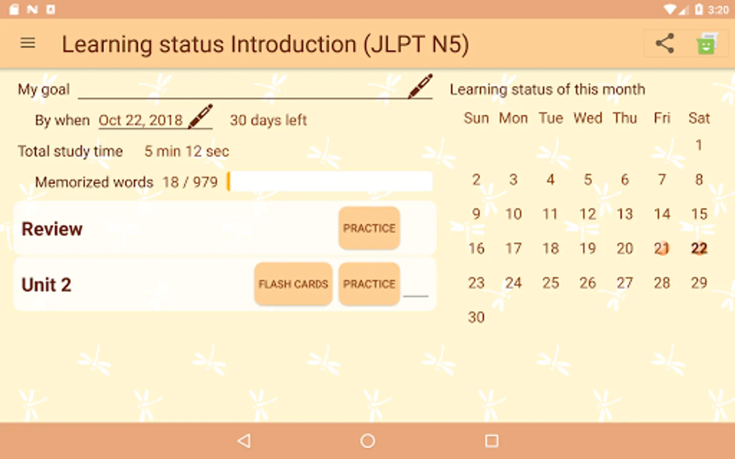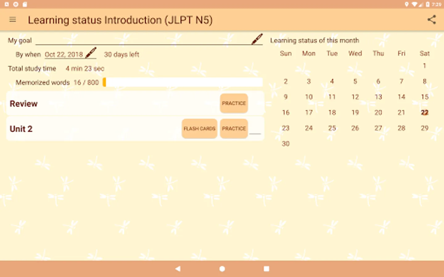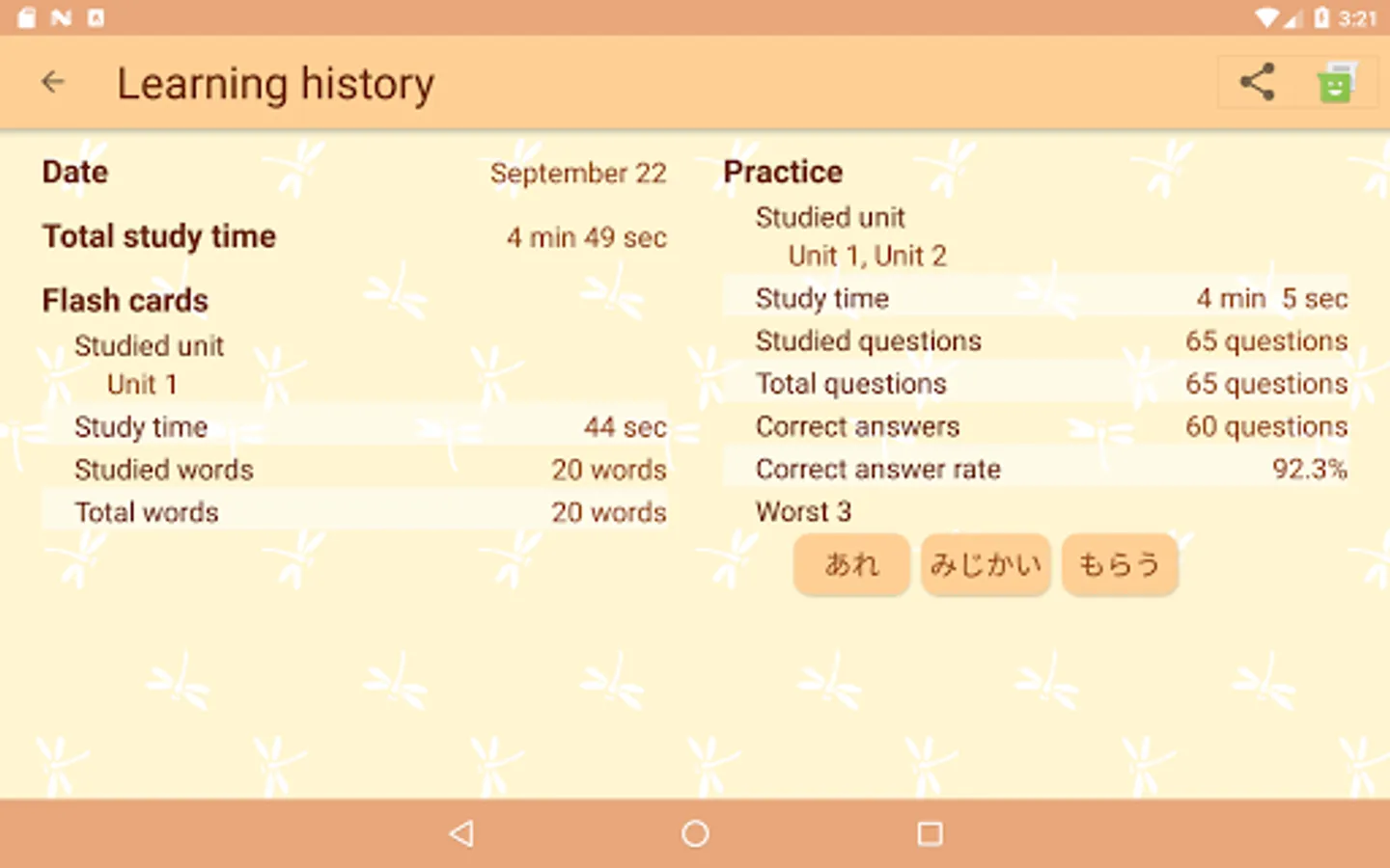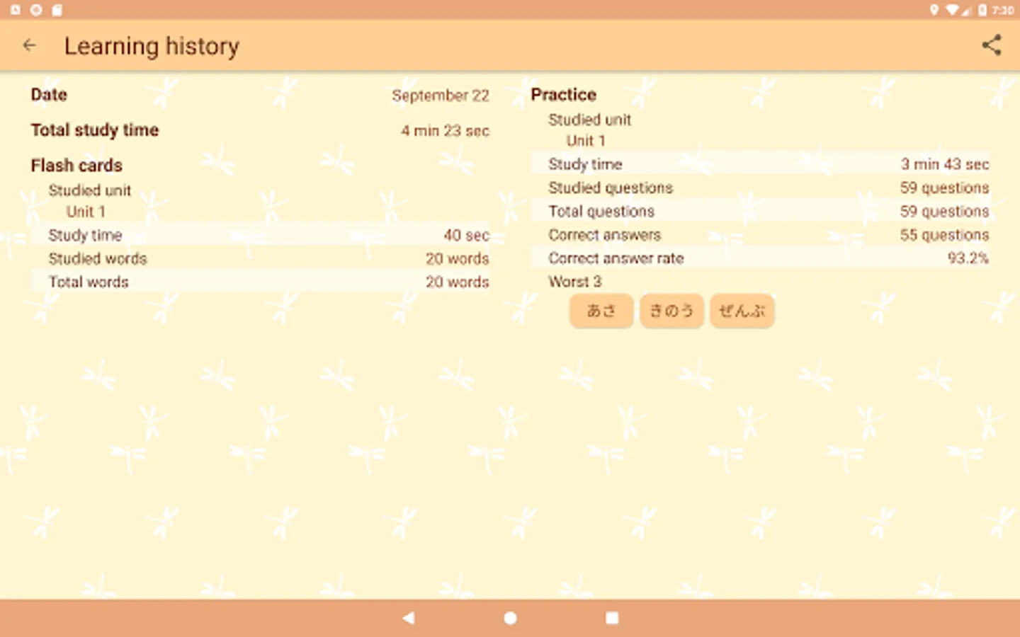 This feature intensively presents the Kana and words which are weak based on learning history. So you can practice efficiently.
