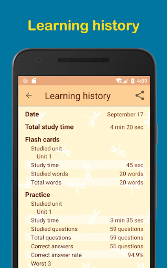 This app records your daily learning status. Thereby, you can check the study time, the correct answer rate, the weak words, etc. Also, this app displays the understanding of individual word, unit, and overall as a graph. So you can understand the situation at a glance.