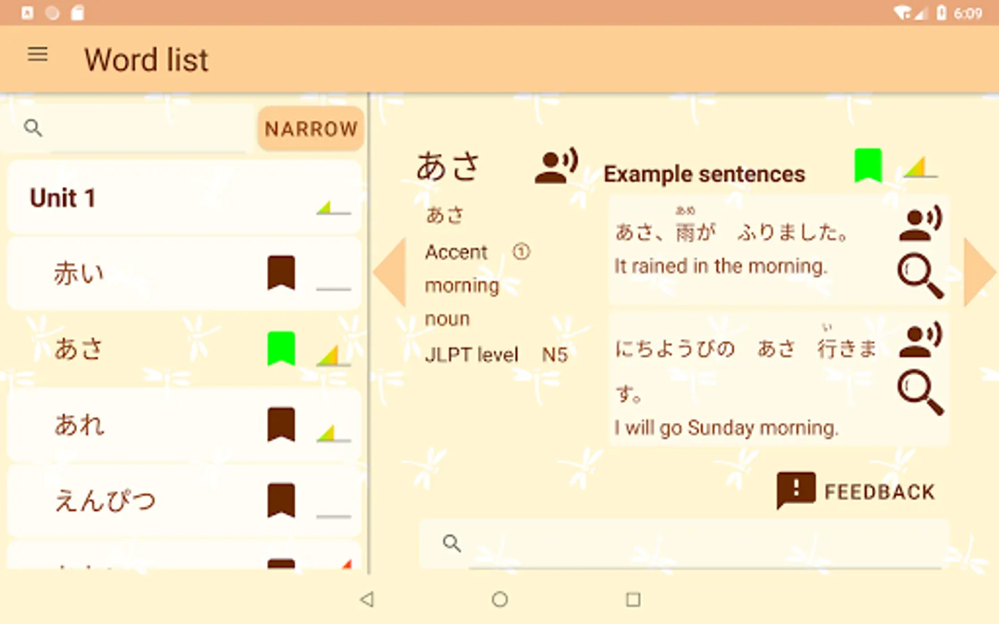 Flashcards have words on the front and information such as meanings and example sentences on the back. You can check them repeatedly until you memorize them. This feature can also play pronunciation. Therefore you can use it not only for memorization but also for repeating and dictation. Besides, you can select the flashcard to use by the card you do not memorize, the part of speech of the word, etc.