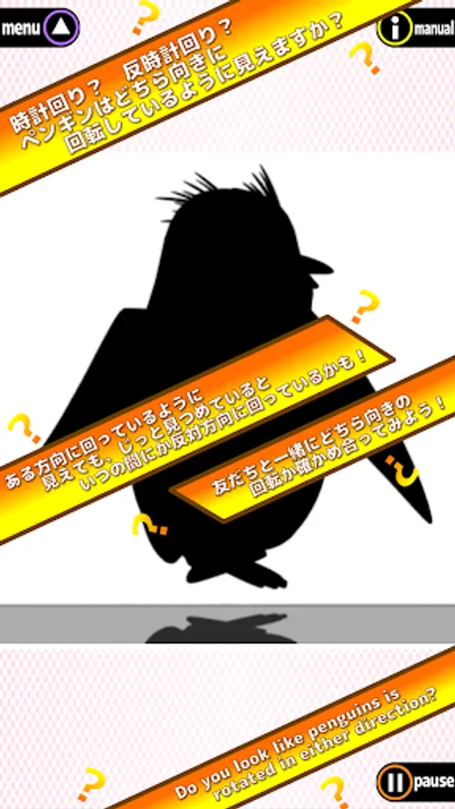 (10)"In which direction is this penguin rotating ?" : Clockwise? Anti-clockwise? In which direction does the penguin seem to be rotating for you ?