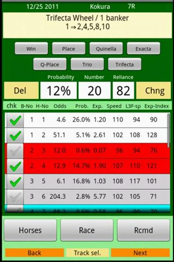 On the customize screen (Cstm) the user can see the probability and ticket number suited horses, ticket and ticket type that the user chose.
