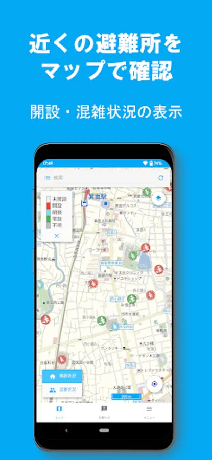 "Hazardon" is a disaster prevention app that receives notifications of information from local governments using SpeeCAN Timiline / RAIDEN, displaying maps showing evacuation shelters and shelters nationwide, displaying hazard maps.