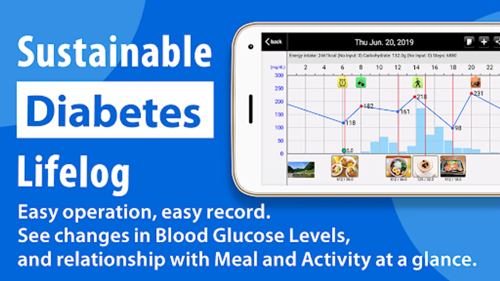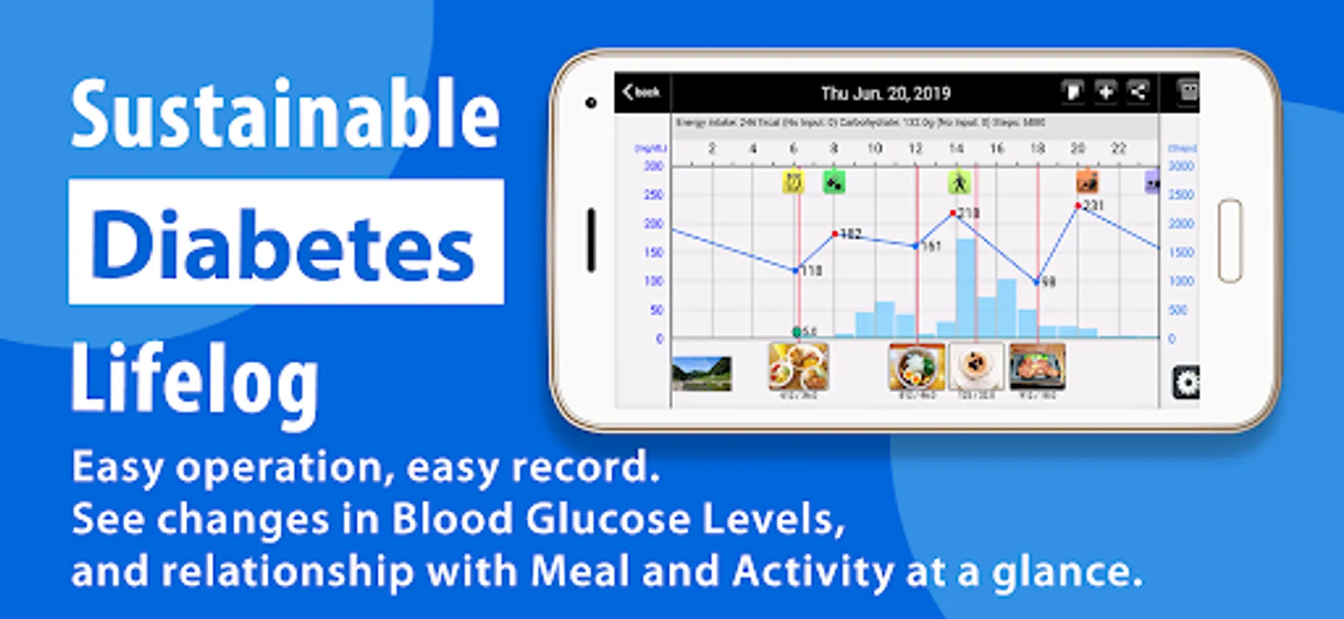 It is easy to know the swing of Blood Glucose Levels, or Blood Glucose Level related data like Meal (photos), Steps at first sight. You can examine your daily life intuitively.