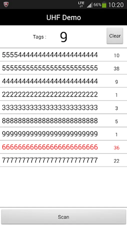 ・ Tap the [Scan] button at the bottom of the screen to start detecting RFID tags,