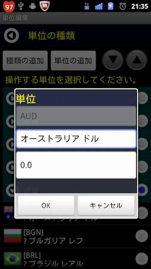 標準の単位変換も豊富に用意されていますが、自分自身で単位を簡単に追加することもできますから単位変換の組合せはあなたしだいです。通貨レートをサーバよりダウンロードする事ができますので、簡単に現在のレートによる通貨換算を行う事が可能です。初期設定では33ヶ国ですが、通貨コード(英字3桁)を追加する事によりそれ以外の通貨も利用いただけます。
