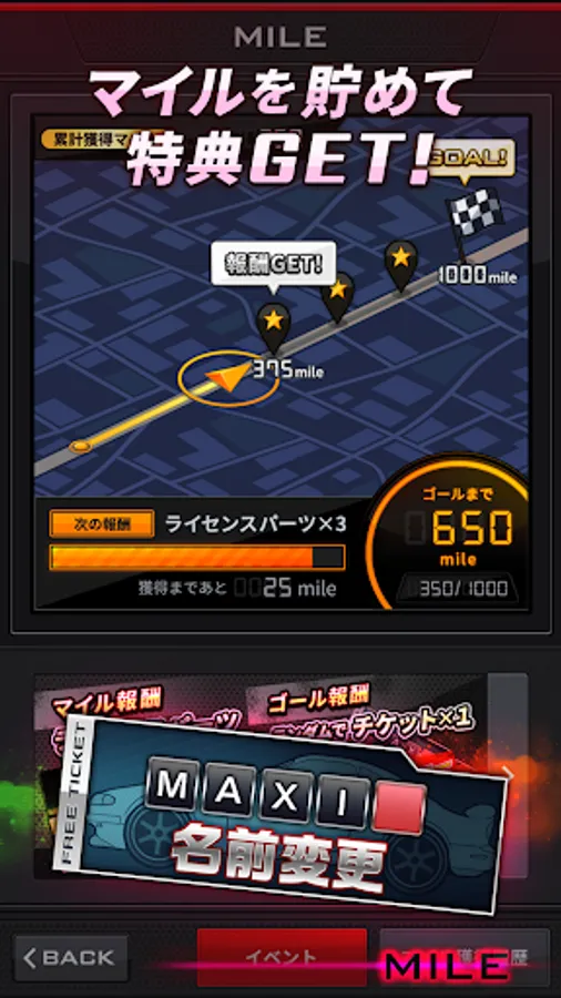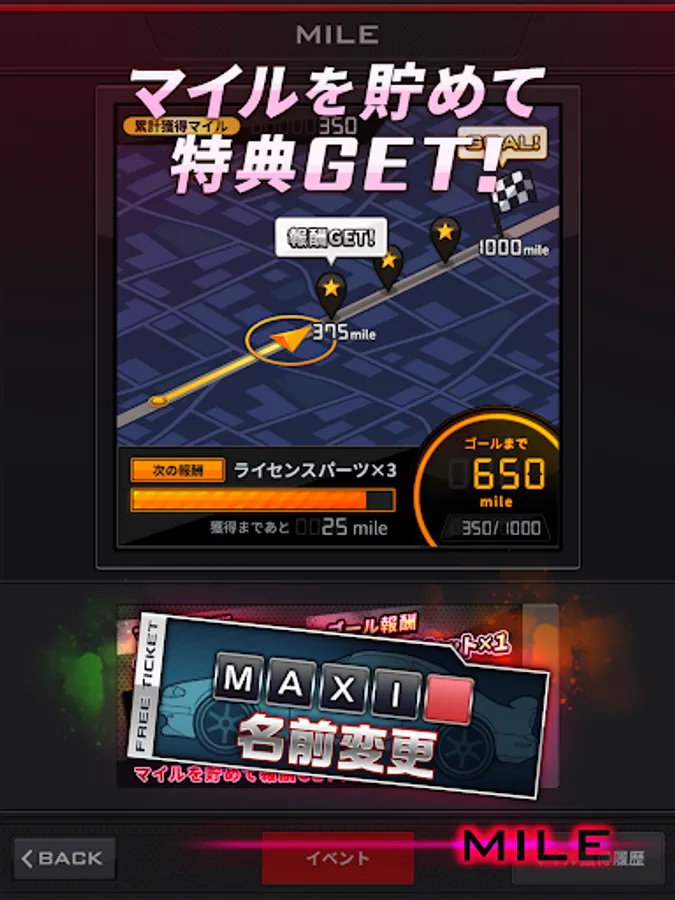・ When you earn miles, you can get "Intrusion Battle Continue Free Ticket", "Scrapped Car Card", etc. that can be used in the game!