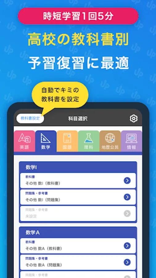 Preparation and Review Efficiency UP is an app that is ideal for preparing and reviewing classes that support English, mathematics, and Japanese (old and Chinese) textbooks and some supplementary mathematics teaching materials.