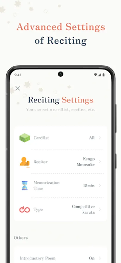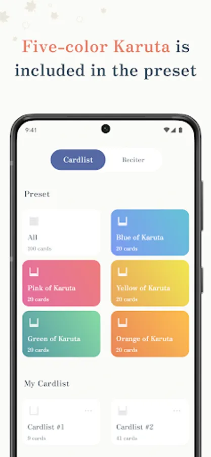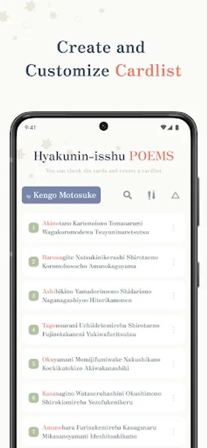 You can select the card to be used for reciting from Hyakunin-isshu, and customize the cardlist to suit your own use.