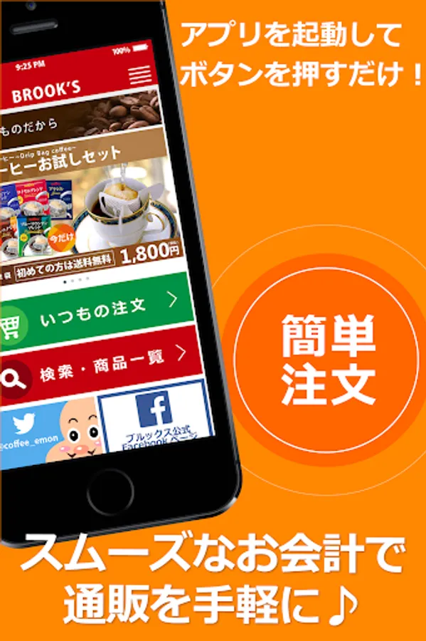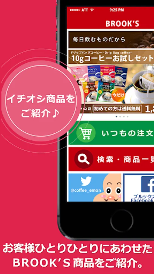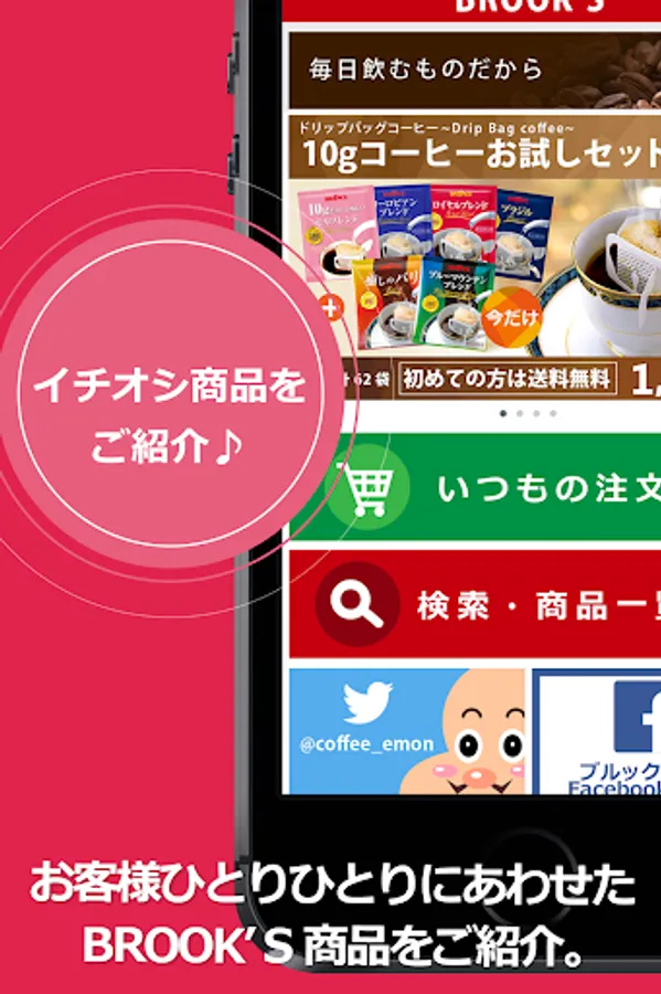 コーヒー通販のパイオニア、BROOK’Sの公式ショッピングアプリがついに登場!コーヒーはもちろん、日本茶、紅茶、健康茶、コーヒー等を楽しむグッズ、ローションやオーラルケアまで取りそろえた豊富な商品を、いつでもどこでも気軽にショッピングできます。