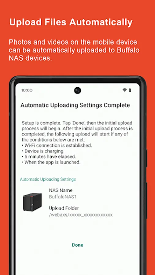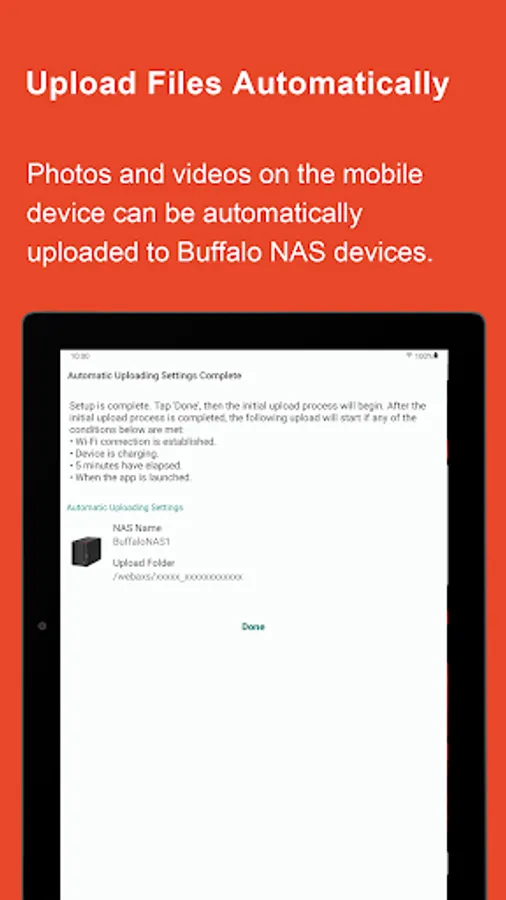 • File upload: upload files, such as photos, videos, and songs, to your Buffalo NAS device so you don’t have to worry about using up storage on your mobile device. Files can also be uploaded automatically from your mobile device using automatic uploading.