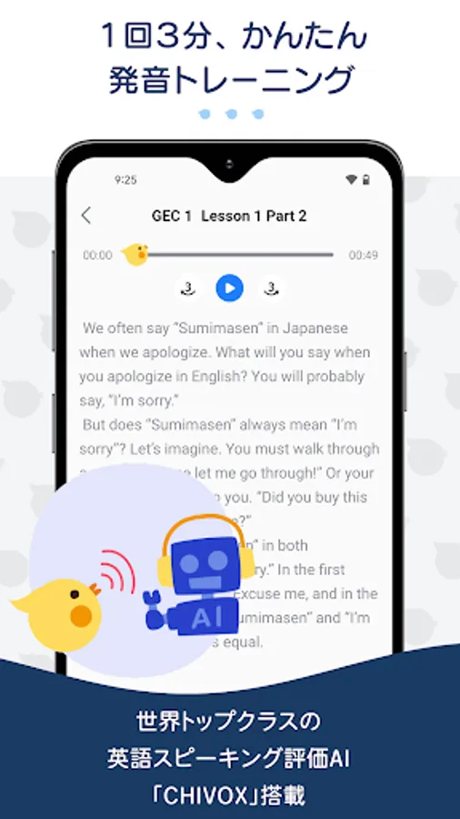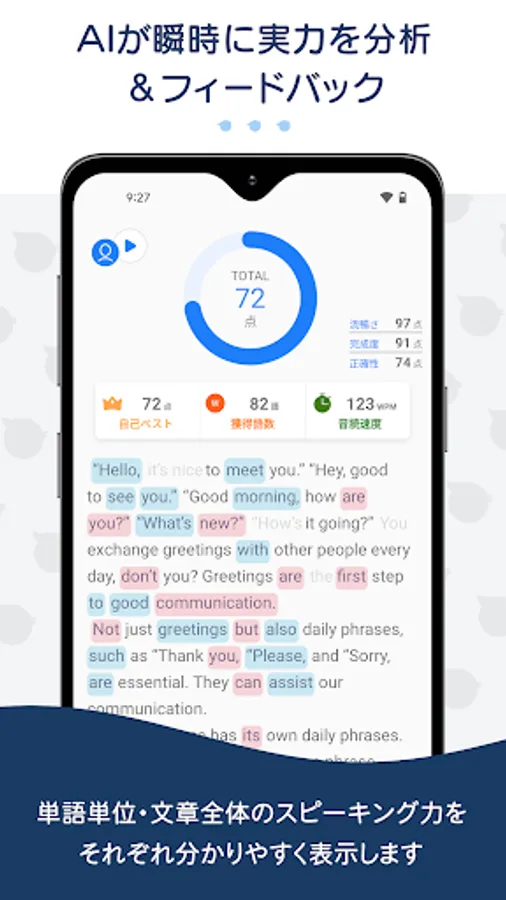 The results of reading aloud are visually evaluated and fed back by AI evaluation, and you can review your weak points repeatedly.