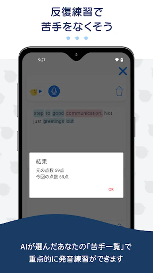 - Words and sentences that you couldn't pronounce well are highlighted, and you can review them as many times as you like.