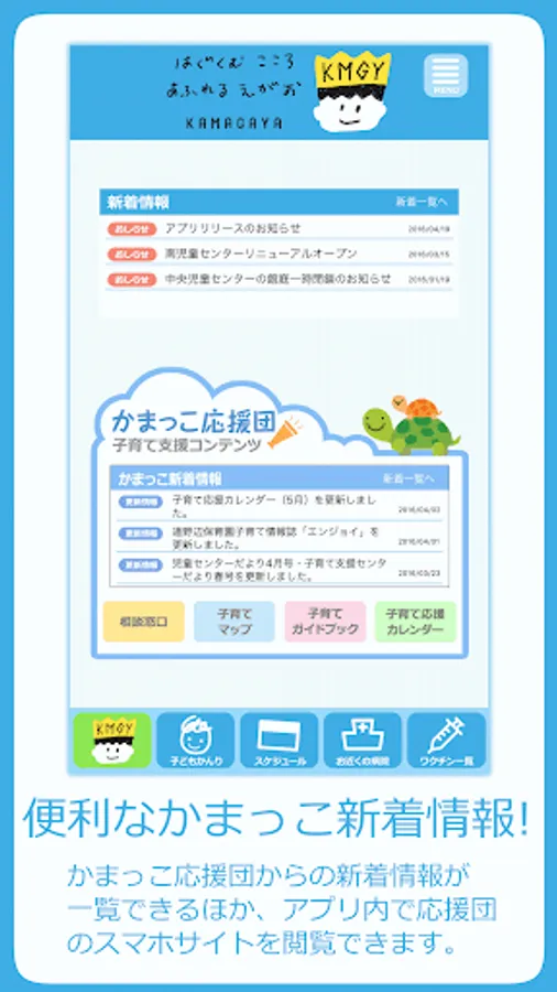 子育て応援サイト「かまっこ応援団」の新着情報をすぐに見られるほか、予防接種のスケジュールを簡単に管理することができます。