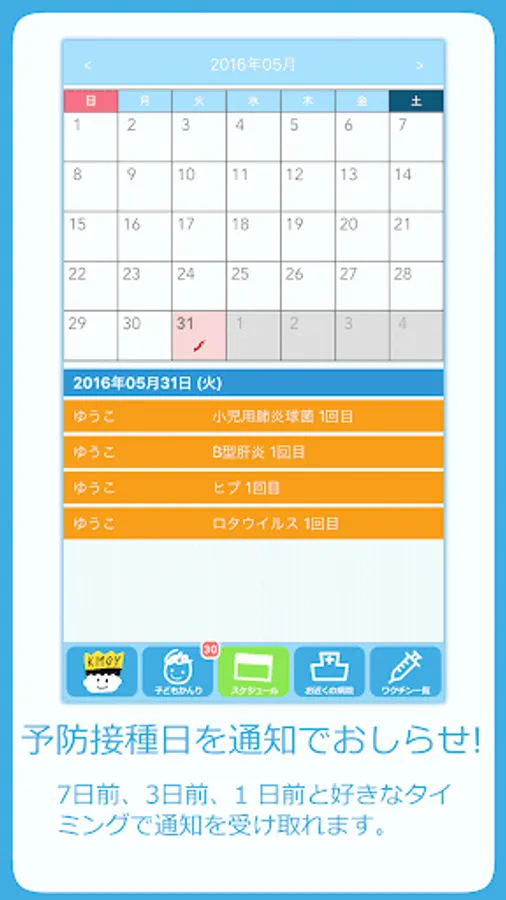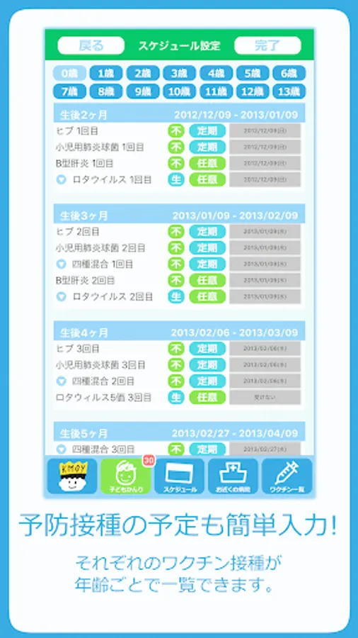 子どもの生年月日を入力することで、0~13歳の予防接種スケジュールを組み立てられます。