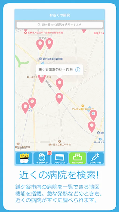 鎌ケ谷市内の病院を一覧できる地図アプリを搭載。急な発熱などのときも、近くの病院がすぐに調べられます。