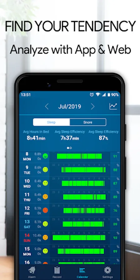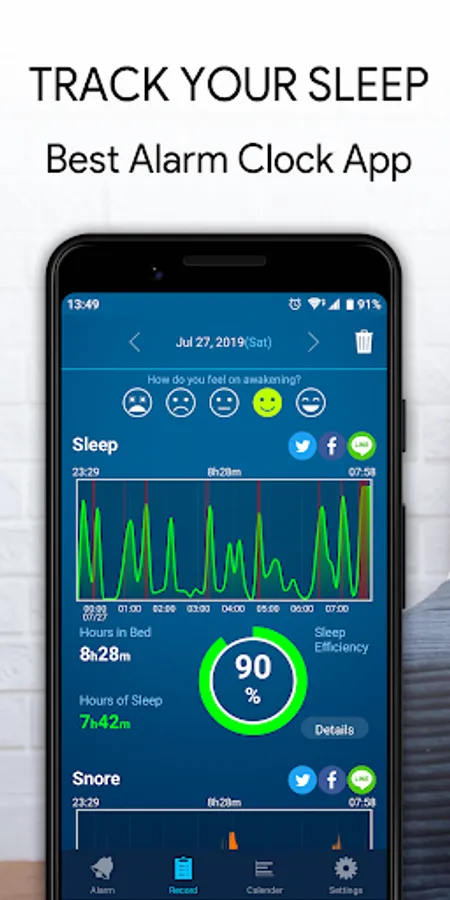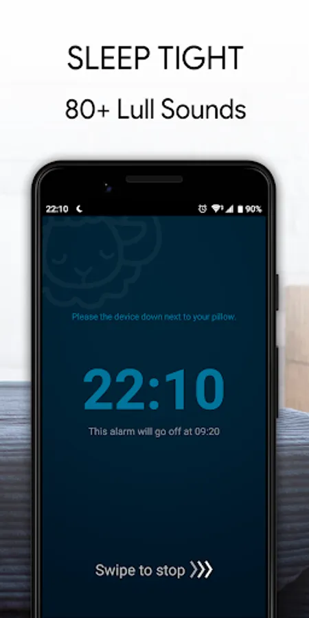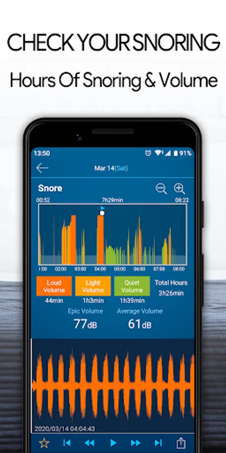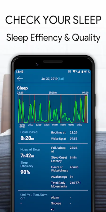 Tap the "Bedtime" button to sleep, swipe to turn off the alarm and get your daily sleep log to find out your sleep (quality, sleep efficiency, and hours of sleep) and snoring (hours of snoring and volume).