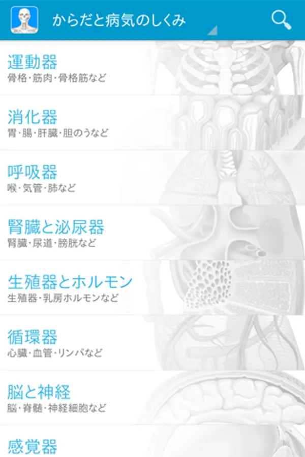 250点を超える詳細カラーイラストで、からだの各部位の働きと病気のしくみを分かりやすく図解化したアプリです。