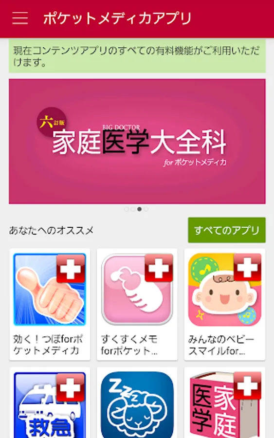 A group of apps categorized by purpose, such as investigating illnesses, examining drugs, or examining hospitals (in the content app, “for Pocket Medica” is listed at the end of the app name).