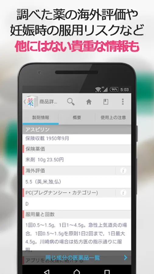 This is an Android application that contains the entire database of "The book that understands the medicines given by Hoken doctor 32nd edition". About 13,000 drugs that are often prescribed, we provide the information you need to use them safely.