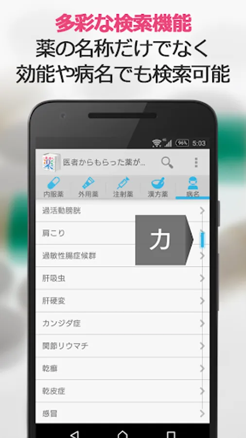 ・You can search for drugs that are mainly prescribed by disease name, such as influenza, allergies, lumbago, and diabetes.