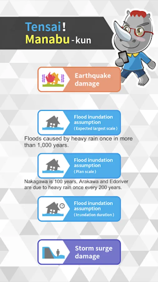 [Tensai! Manabu-kun Katsushika version] is an application that can confirm disaster prevention information such as earthquake disasters and flood disasters in Katsushika-ku, Katsushika-ku, Tokyo and various disaster prevention information such as shelters and flood emergency evacuation buildings on smartphones and tablet terminals. [About the disaster prevention information to be displayed] 1.Flood inundation information This application displays information of the largest scale, the planned scale, and the duration of the flood about the five rivers (Arakawa, Edo, Naka, Ayase, and Tone Rivers). 1) Flood inundation assumption (assumed maximum) The inundation situation when the river was flooded by the flood caused by heavy rain once in 1000 years or more was predicted by simulation. 2) Flood inundation assumption (inundation duration) The inundation duration is displayed based on the provisions of the Flood Control Law, and the inundation situation (time during which the inundation depth of 50cm or more continues when the river is flooded by the flood due to the assumed maximum scale rainfall) was predicted by simulation. 3) Flood inundation assumption (planned scale) The inundation situation was predicted by simulation when the river was flooded by the flood caused by heavy rain once every 200 years (Nakagawa once every 100 years), which is the basis of the flood protection plan. Note: There is no indication of inundation in the ward of the Ayase River. 2.Storm surge inundation information The Tokyo Metropolitan Government has created a map of the expected flooding area for the risk of flooding due to the largest possible storm surge, and displays the expected inundation information and the duration of the flood. 3. Earthquake risk information In this application, among the results of the Tokyo Metropolitan Bureau of Urban Development ,the area risk measurement survey related to the earthquake, displays the fire risk and building collapse risk. 1) Fire risk information In the event of an earthquake, you also need to be alert to fires. Displays the fire risk in five stages. Taking into note the risk of fire based on fire, the rate of fire and usage of electric appliances, etc., as measured by the Tokyo Fire Department, and the risk of spreading fire based on the structure and spacing of buildings, the spread of fire scaught in the earthquake, We measure the degree of risk of damage in large areas. 2) Building collapse risk information Similarly, it displays the risk of collapse of buildings that need to be alerted in the event of an earthquake. Taking into account the type, structure, building year, and ground characteristics of buildings, we measure the degree of risk of buildings being broken or tilted due to earthquake shaking. 4.Information display of shelters, etc. For earthquake damage, you can display the location information of flood emergency evacuation buildings for shelters, temporary meeting places, evacuation sites, flood sand and storm surge damage. At the same time, the name of the nearest shelter, etc., and the direction and straight estedate from the local point are displayed. [Precautions for use] This app is not intended to be used in the event of a disaster, it is made on the premise that you use it in advance as a preparation for daily disaster prevention. In the event of an actual earthquake or disaster, it may exceed the expectation depending on the scale. Regardless of the area displayed in the app, if there is a risk of fire or collapse due to the damage caused by an earthquake, please act at your own risk. [About supervision] Supervised by Professor Takaaki Kato, Institute of Industrial Science, The University of Tokyo "Tensai! Katsushika edition inquiries Katsushika City Crisis-Management Division 052000@city.katsushika.lg.jp [What is AR hazard scope?] For inquiries about AR hazard scope, please click here. Cad Center Co., Ltd. https://www.cadcenter.co.jp/products/archives/7
