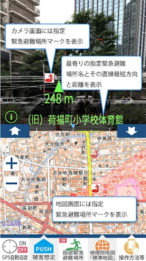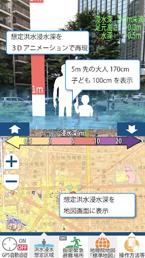 "Oita Flood Hazard App" is an app that displays information on flood inundation assumptions and designated emergency evacuation sites in Oita City, Oita Prefecture. In conjunction with the GPS information, the disaster prevention information of the current position is combined and displayed with the live-action video taken by the camera.