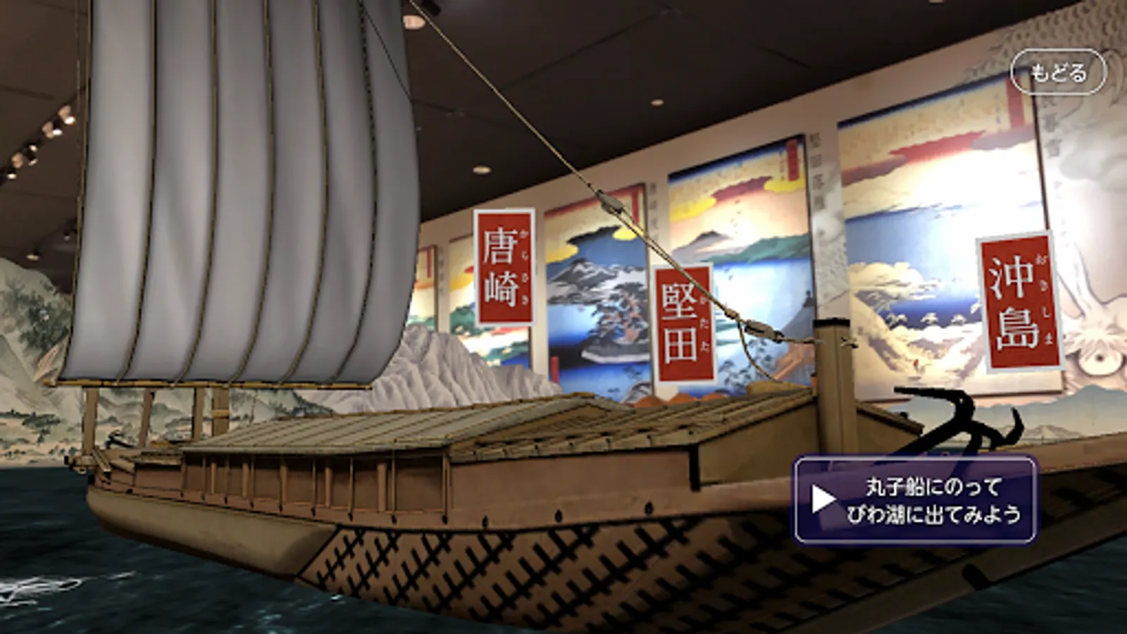 When you hold your camera over the "Omi Hakkei" displayed at the Lake Biwa Museum, a full-sized Maruko ship appears, and you can enjoy a picture of the Maruko ship running in the landscape around the Edo period.
