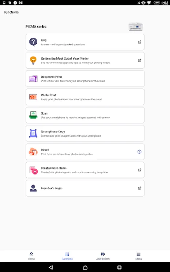 With this app you can set up your printer, and start printing and scanning. It also provides various handy functions such as checking consumable levels, and printing via the cloud.