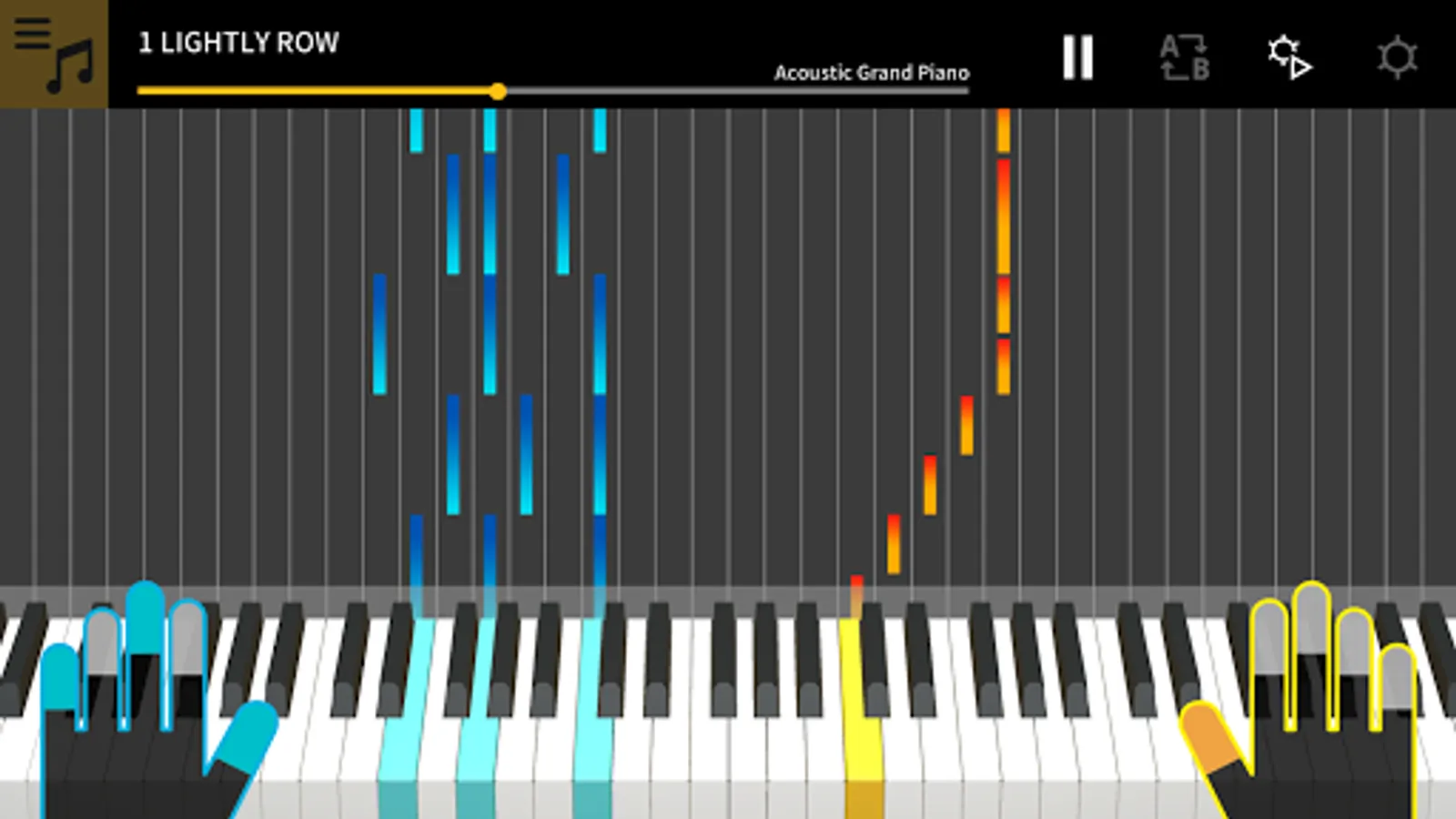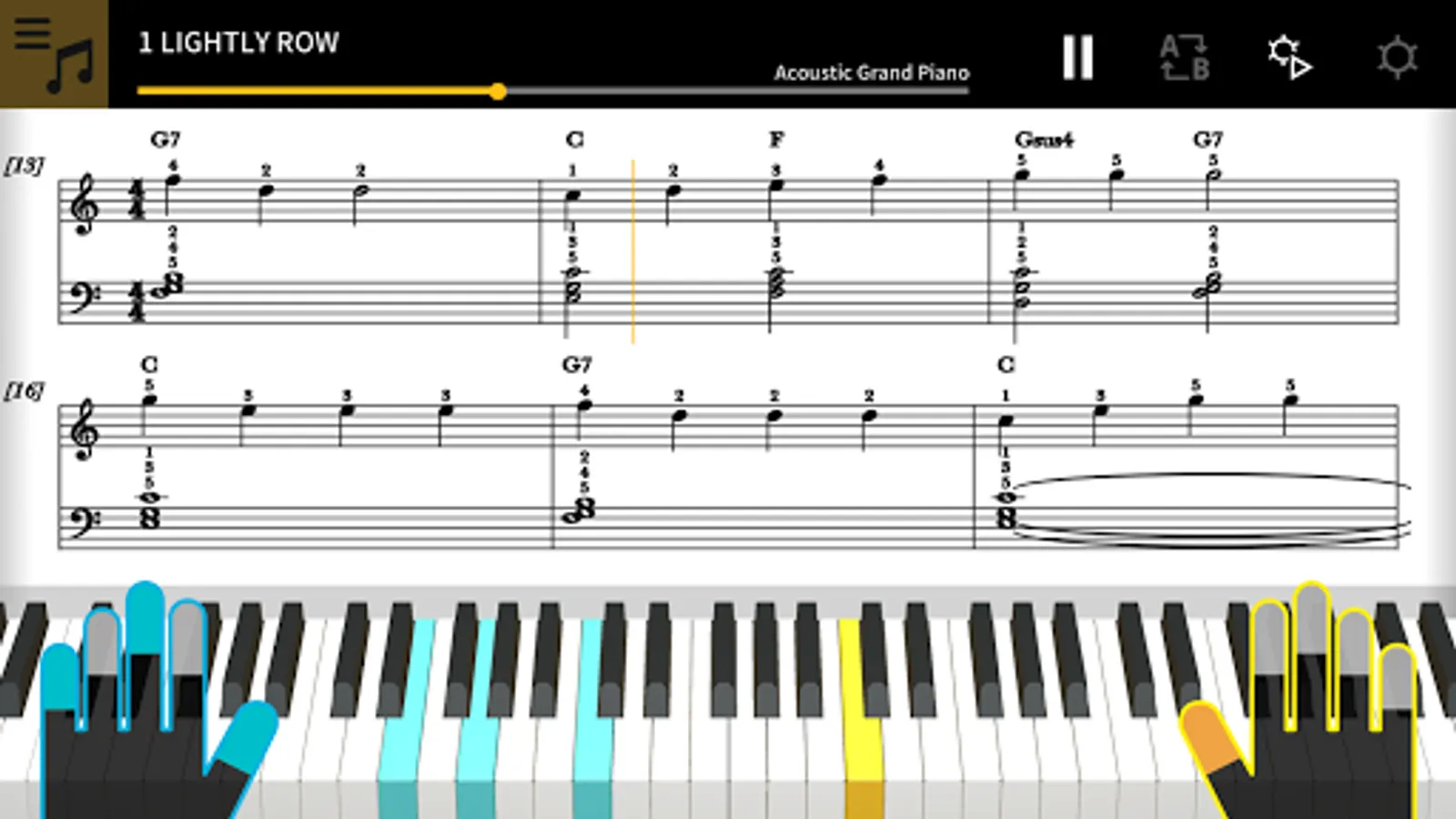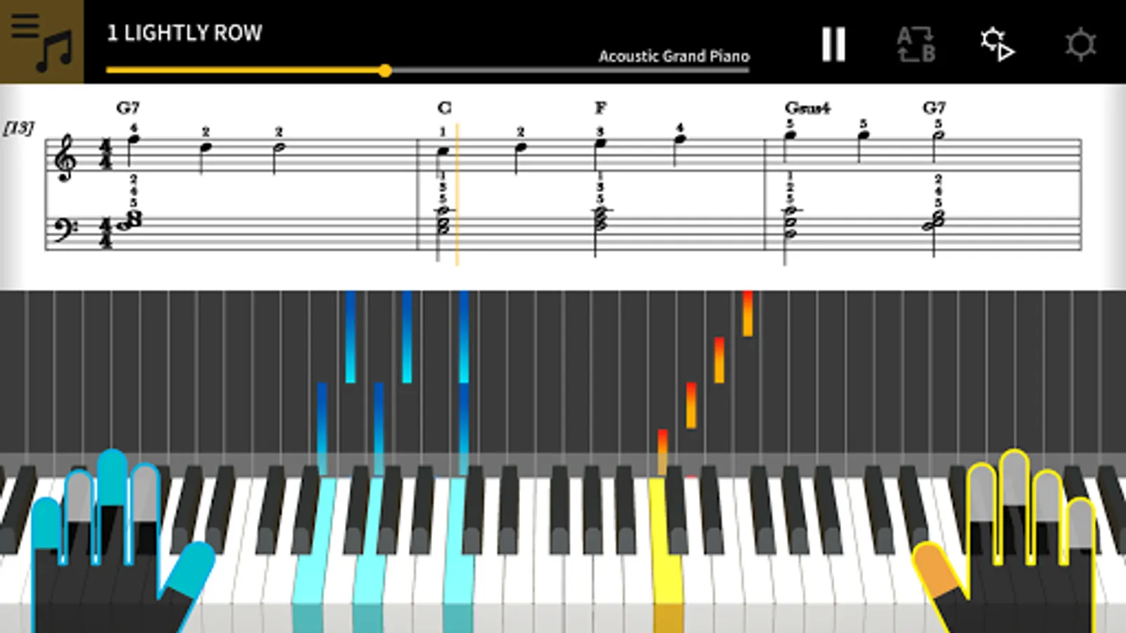 Using either the app's keyboard or a USB-connected musical instrument keyboard, you can take a three-step lesson while following the music score and piano roll.