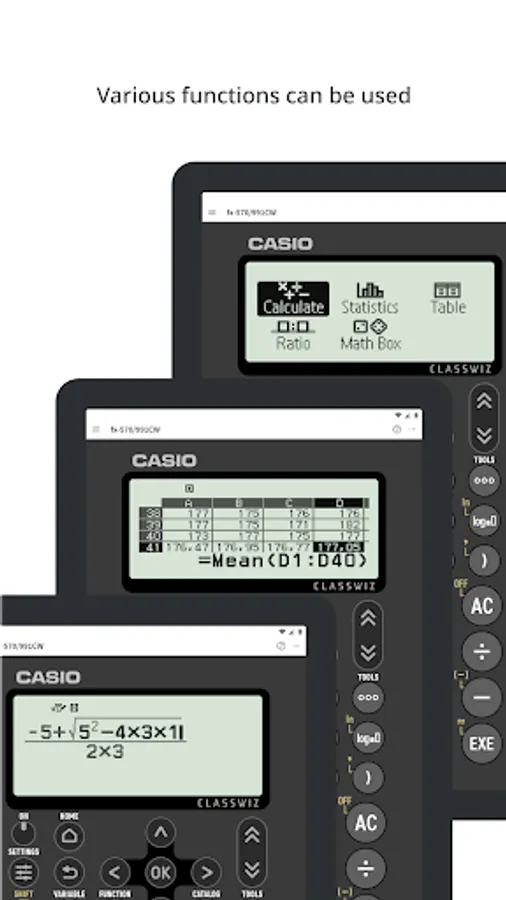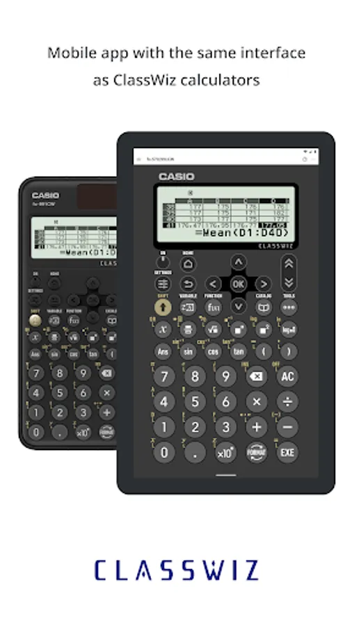Through this app, users can use a wide range of ClassWiz functions with ease. This includes statistical calculations, spreadsheets, matrix calculations and graph display functions through ClassPad.net connectivity.