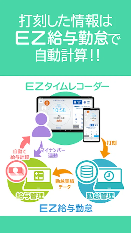 Attendance data for each employee registered with the EZ time clock can be aggregated and payroll can be calculated automatically. Details output, social insurance processing, year-end adjustment processing are also possible, and it is also linked with My Number service.