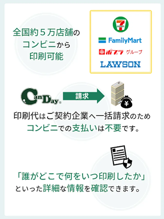 You can easily print document files and photos on your smartphone or cloud at 50,000 convenience stores. (App for corporations)