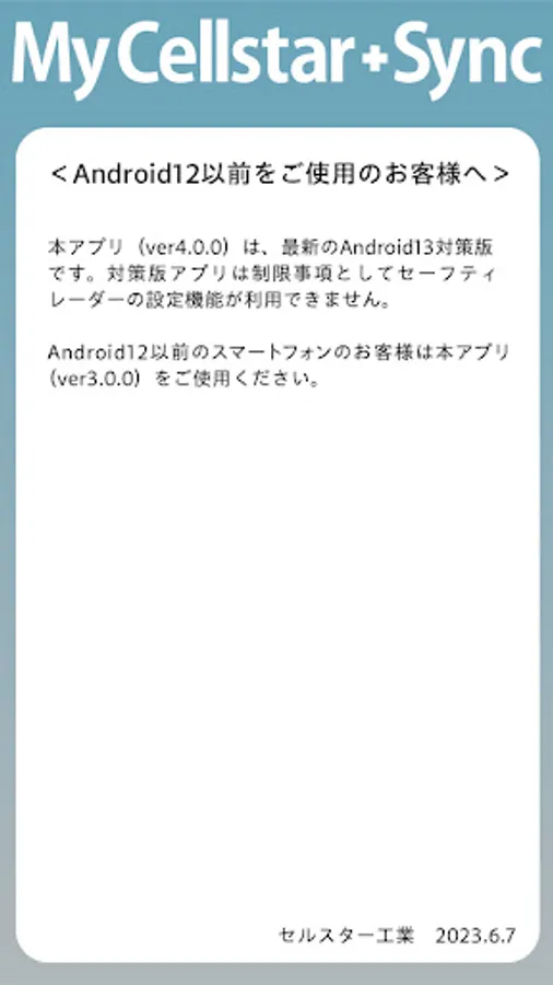 This application (ver4.0) is a countermeasure application for Android13. If you are using a smartphone with Android 12 or earlier, please use the existing app (ver3.01).