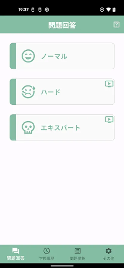 "Hard": The list of options is shuffled, but the number of answers to be selected is specified. Difficult mode where you can answer correctly if you understand the content properly.