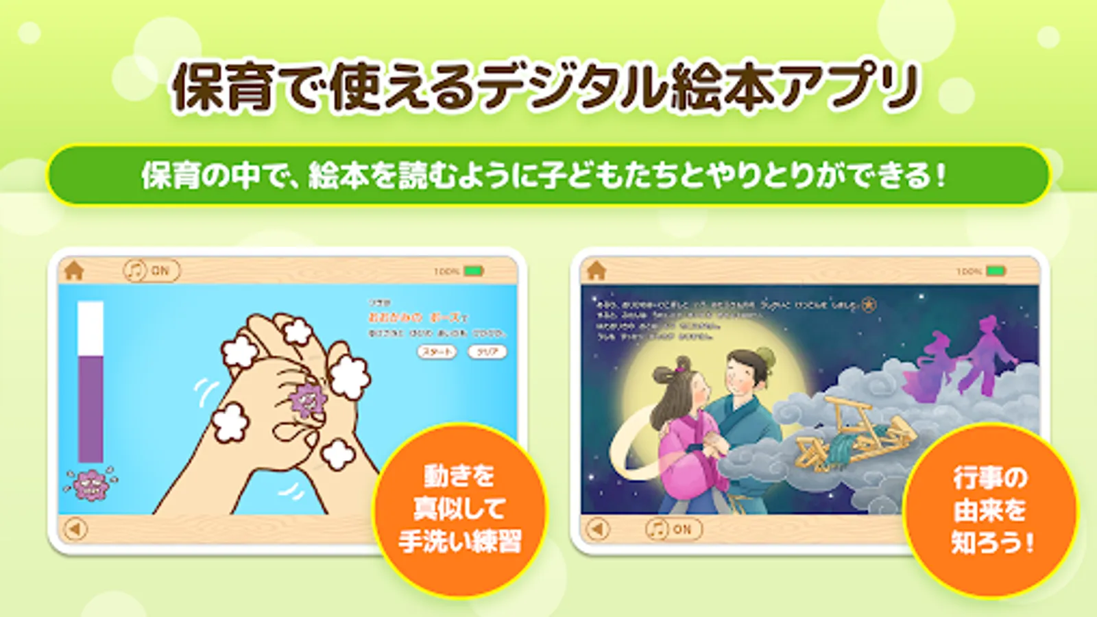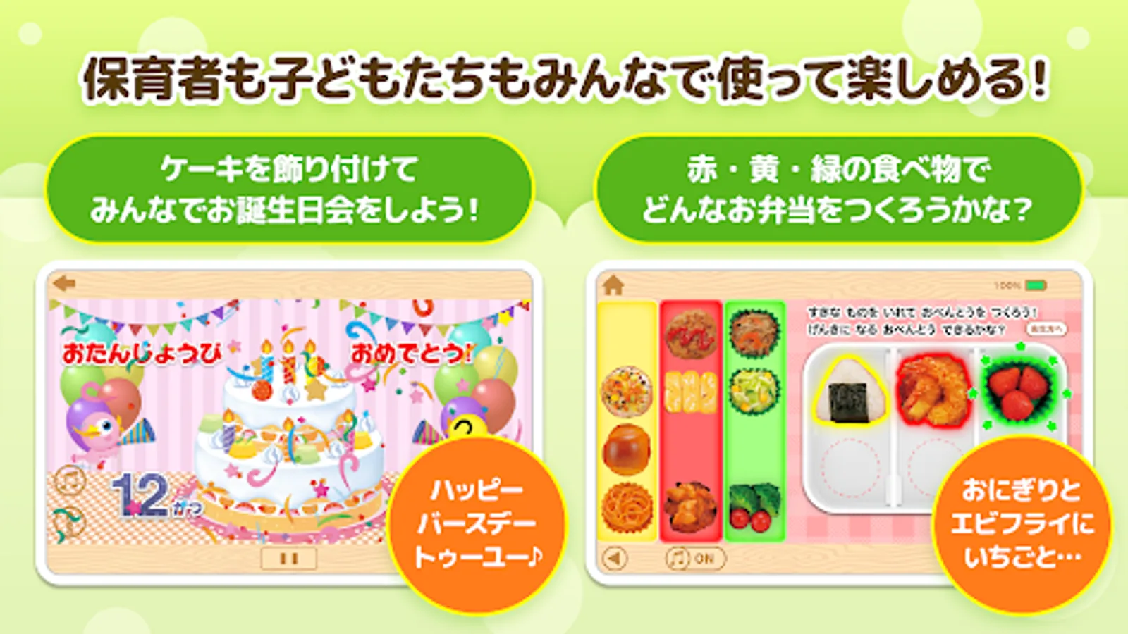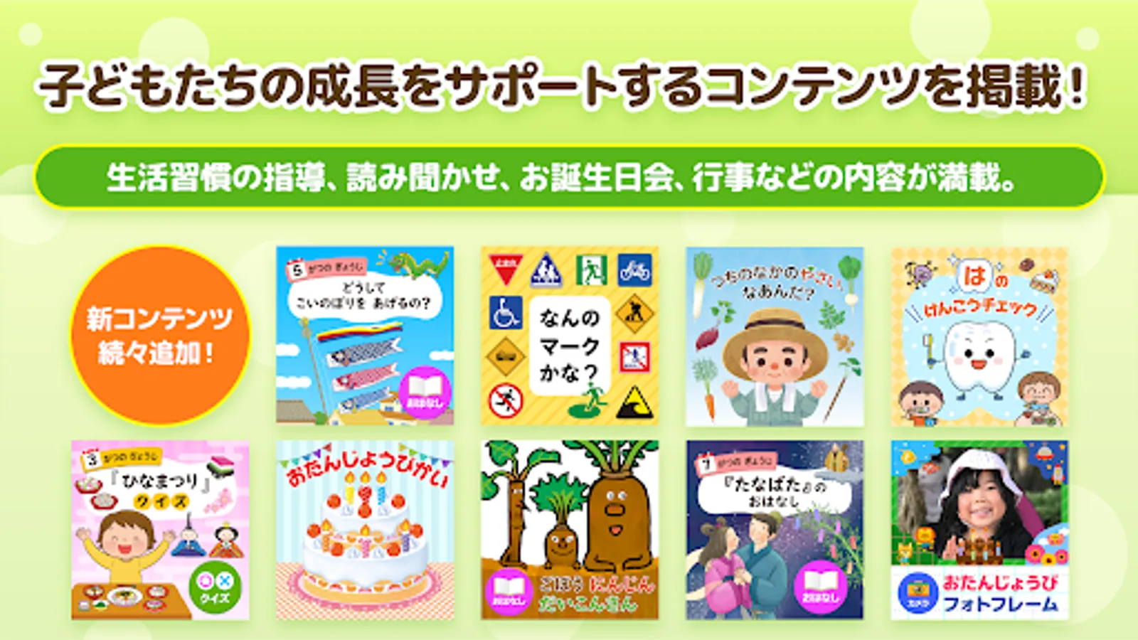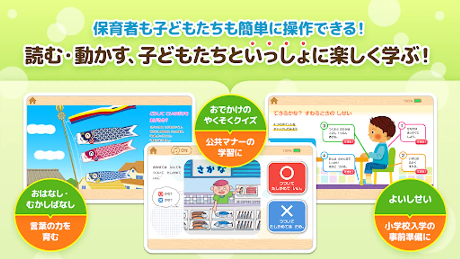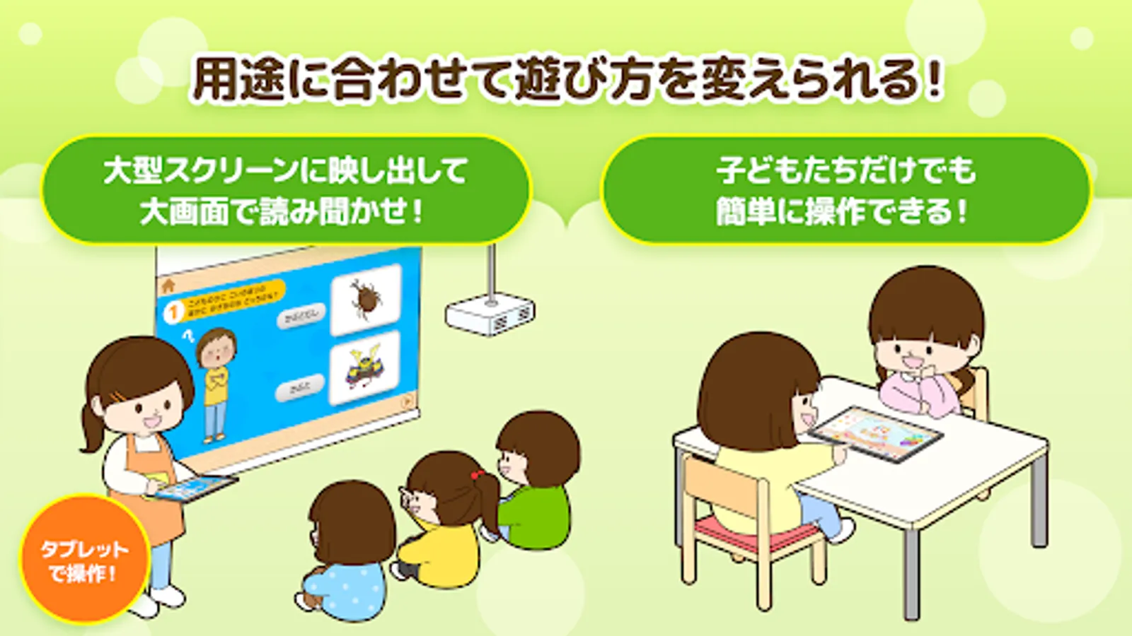 Issho Yomuzo is a childcare teaching material application for children aged 3 to 5 years. You can use a lot of contents that can be used in daily childcare.