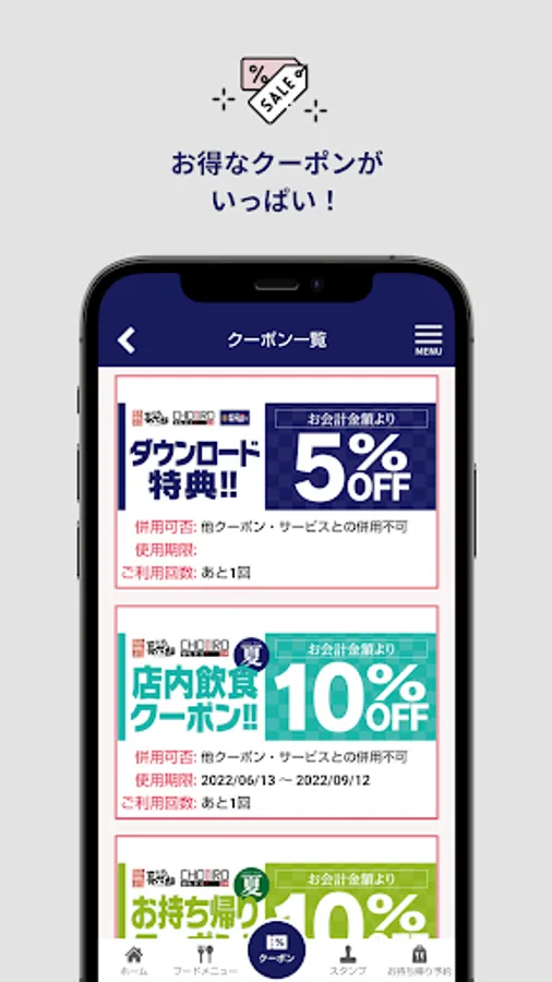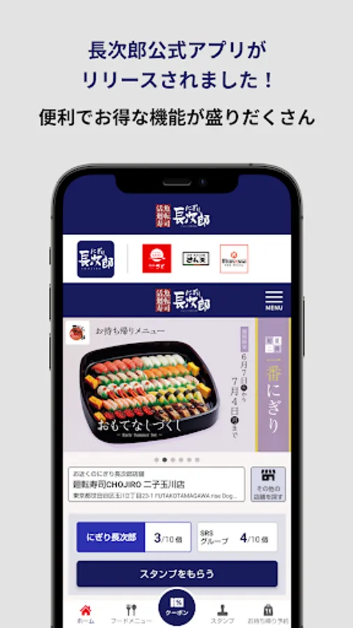 You can receive stamps at Chojiro's shops and SRS Group (Washoku Sato, etc.).