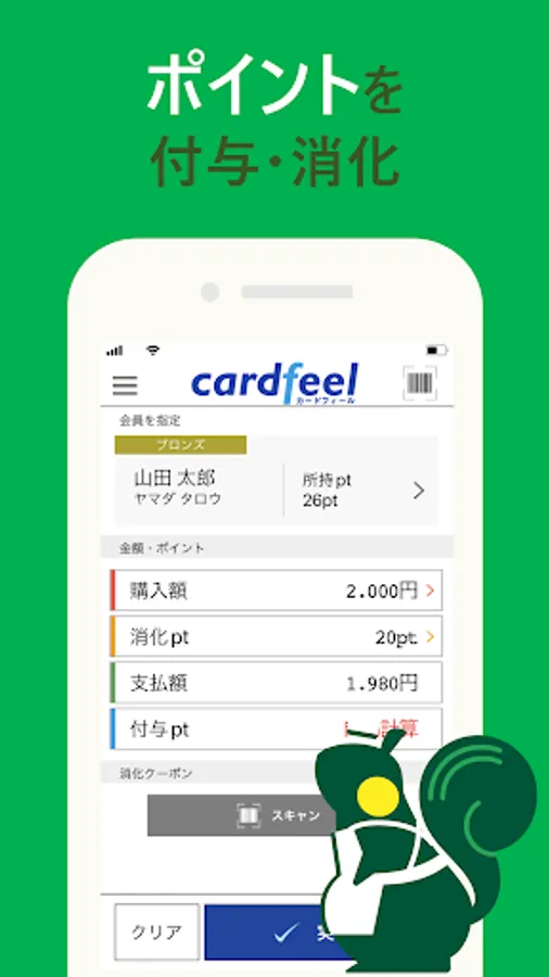 Scan the barcode with the camera from the membership card screen of the membership card or membership application, enter the amount and the number of points, and execute.